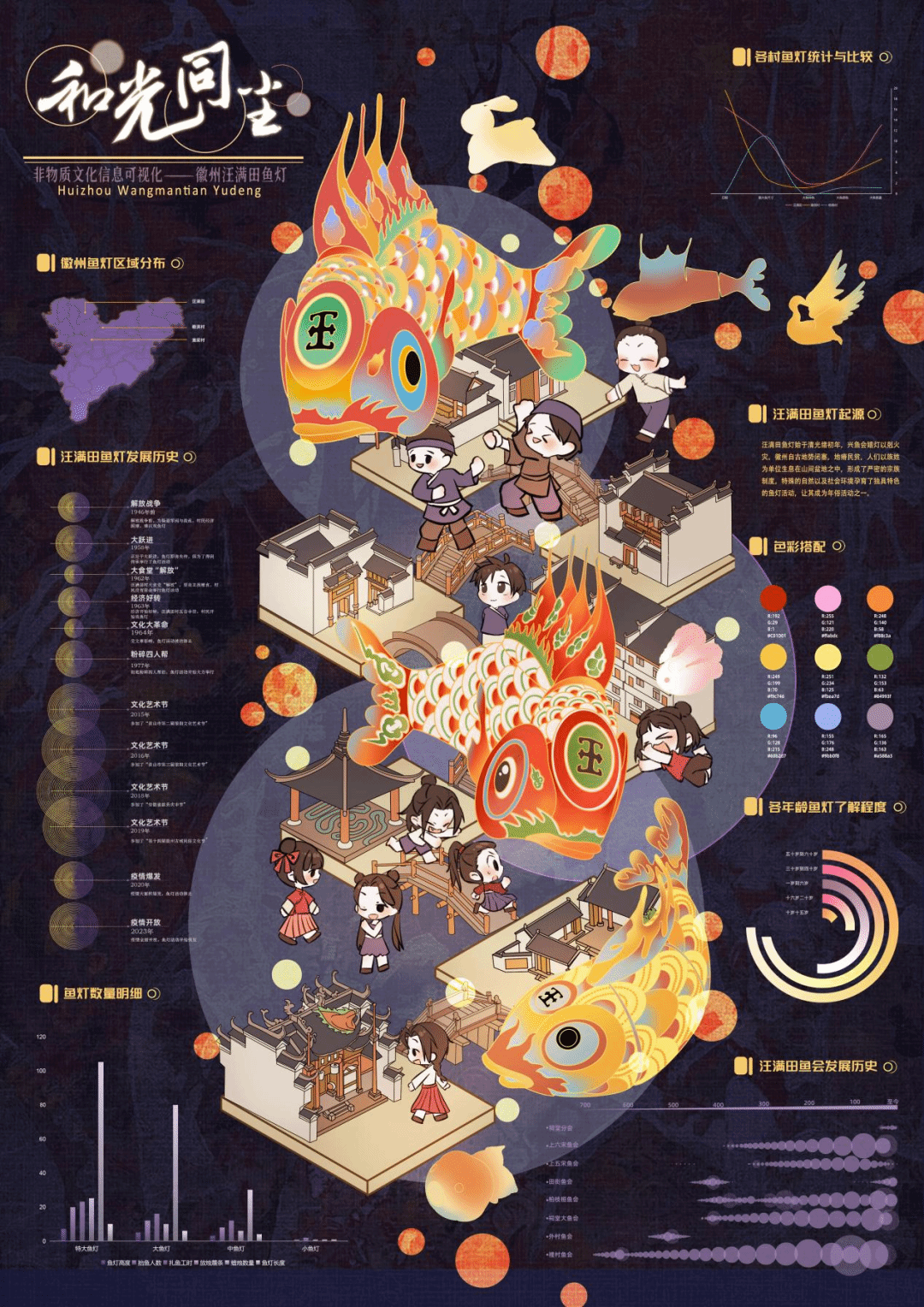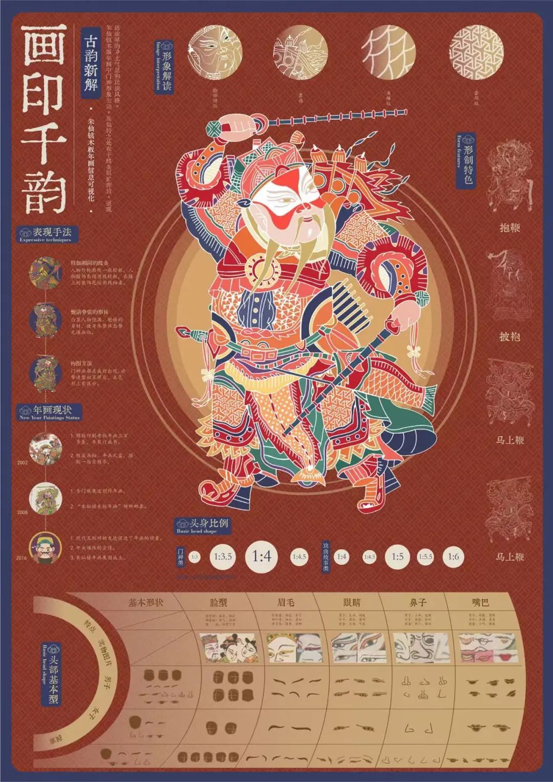 设计理念:这组信息可视化设计作品以木板年画为主题,通过将传统艺术与现代设计理念相结合,运用时间线、图示、色彩信息统计图和流程图等视觉元素,直观地展现了木板年画的历史脉络、形象解读、形制特色、表现手法、年画现状、传承人、工艺流程以及色彩来源和配色规律,旨在以创新的视觉呈现方式,让观者深入理解并感受到木板年画的艺术魅力和文化价值,同时强调了保护和传承这一传统艺术的重要性。