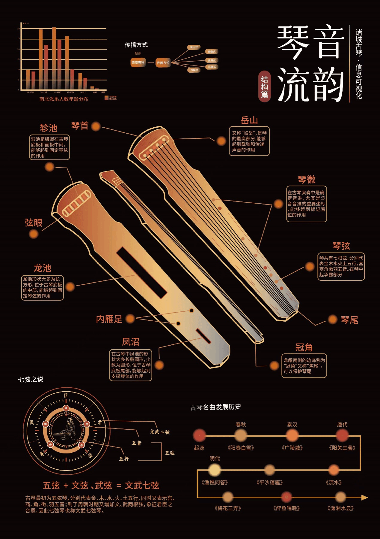设计理念:根据对诸城古琴的调研,我们提取五个主要的部分进行信息可视化。分别为传承篇、指法篇、琴谱篇、结构篇和情感篇。内容主要是针对于诸城南北两派的研究对比来突显诸城古琴的风格与研究。在风格上,排版简约给人轻快的感觉又彰显了古琴的大气。我们打破了传统古色古香的风格,通过多种尝试最终选取了以黑色为底,主体主要为古琴的亮橙色,以黑色和橙色的色彩对比来凸显主体,给人带来强烈的视觉冲击力。使得整体既有现代风又没有偏离传统的古琴色彩。