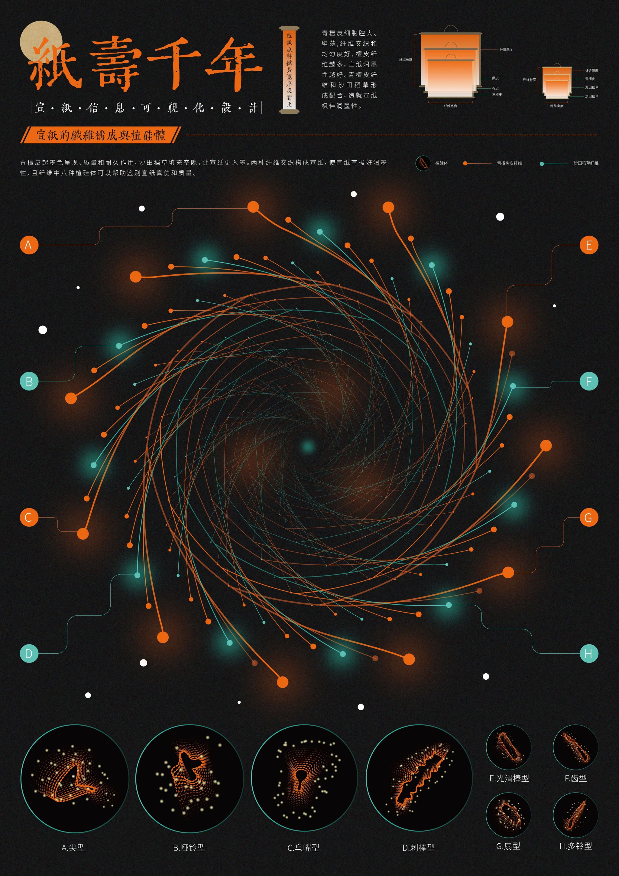 设计理念:探索传统宣纸的奥秘,从精选的原料到繁复的制作工艺,再深入地分析宣纸内部的纤维结构及其对宣纸润墨性的影响,以及宣纸的鉴定,由大到小,由外到内的剖析宣纸中的密语。提取宣纸的核心原料、纤维乃至微观细胞等元素,将它们转化为设计符号。通过符号生动而准确地传递着宣纸所蕴含的丰富信息,传承宣纸的历史与文化。以创新性的表达方式,向使用宣纸的书画爱好者和人们进行科普,让观者对宣纸有更深层的认识,更深刻感受到宣纸的非凡魅力,更好的在不同场景下使用宣纸,传承宣纸。