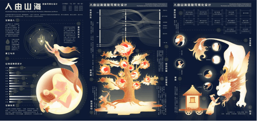 设计理念:对于《山海经》里面:“人从哪里来?”----“谁解救了人?”----“人们怎么知道《山海经》的故事?” 来进行信息可视化设计,分为“女娲”“扶桑树”“白泽”三大主视觉进行联系《山海经》里面关于人的故事 以及《山海经》里面的作者编辑的各种版本流传历程,阐述人与山海经的故事来完成——人由山海信息可视化设计。