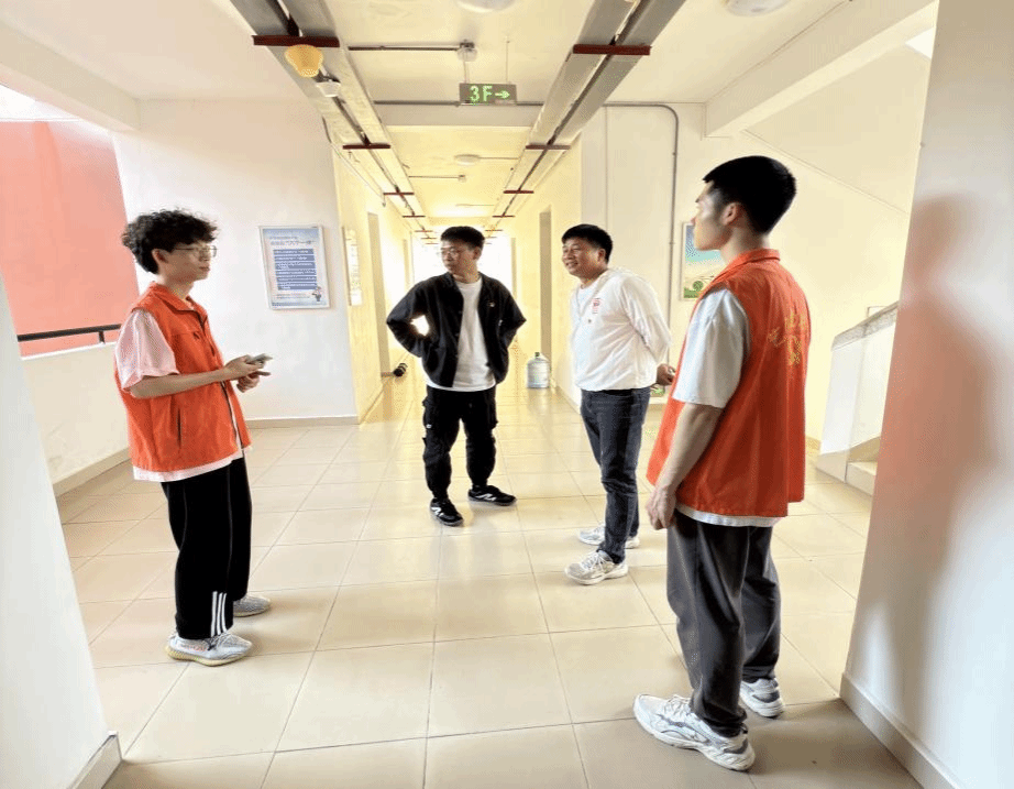 在宿舍公共区域,师生党员着重检查了消防安全通道,提醒同学们整理好个人物品,避免堵塞消防通道,同时保持公共走廊整洁,共同维护社区环境。