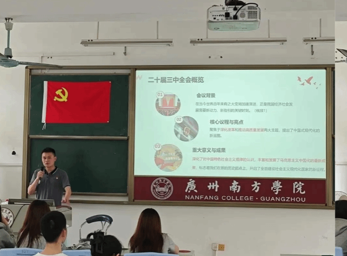 员工第二党支部副书记郭瀚阳老师结合《学习二十届三中全会精神》进行授课。二十届三中全会聚焦国家发展的关键议题,对未来发展规划有着重要指引作用。郭老师深入剖析全会要点,帮助学员理解会议精神在经济、社会、民生等领域的深远影响,让发展对象紧跟时代步伐,把握国家发展大势,为投身党和国家事业做好准备。