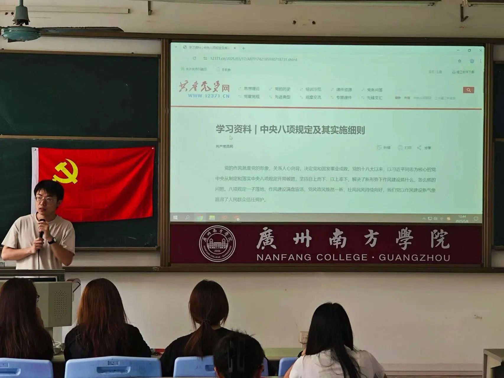 员工第二党支部书记邹清朗老师带领学员开启发展对象培训,深入地学习中央八项规定精神。八项规定是党加强作风建设的重要举措,它关系着党的形象与民心向背。邹老师为大家解读八项规定的具体内容、重要意义,引导学员深刻领悟员工身份的纪律要求,强化廉洁自律意识,让严守纪律成为每位发展对象的行为准则。
