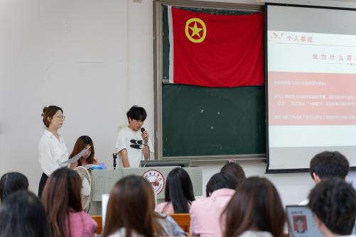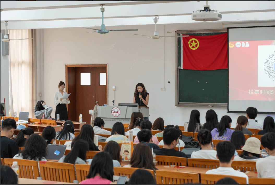李淑娜老师上台致辞,她充分肯定了各位团支书的出色表现。她指出,团支书在基层团组织建设中发挥着桥梁作用,肩负引领青年、凝聚青年、服务青年的重要使命,应始终坚持以同学为本,勇于担当、甘于奉献,争做青年群体的思想引领者和行动表率。她表示,本次评选大会不仅展现了团支书们良好的精神风貌和责任担当,更体现了新时代青年奋发有为、锐意进取的精神风采。最后,她希望全体团支书在未来工作中继续砥砺前行,以更加饱满的热情投身团组织建设,贡献青春力量。