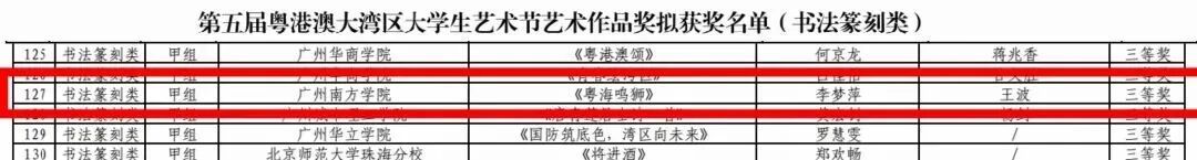 由王波担任指导教师,李梦萍创作的作品《粤海鸣狮》获艺术作品奖(书法篆刻类)三等奖。