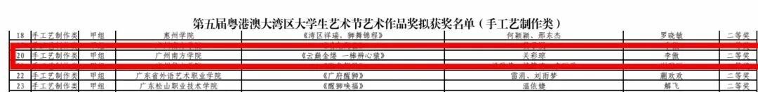 由李傲担任指导教师,关彩琼创作的作品《云巅金缕 一棒辨心猿》获艺术作品奖(手工艺制作类)二等奖。