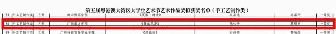 由苏明裕担任指导教师,陈钰怡创作的作品《粤韵风华》获艺术作品奖(手工艺制作类)一等奖。