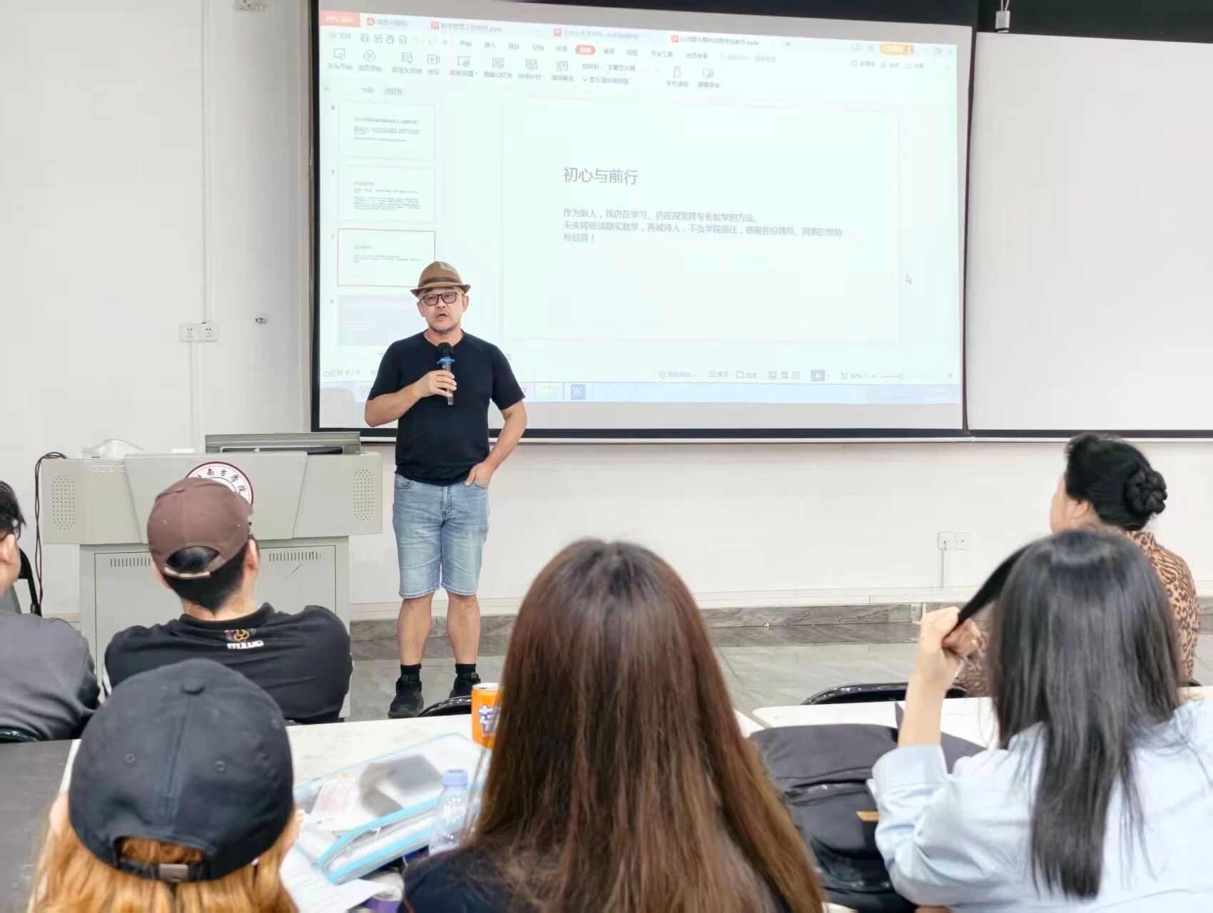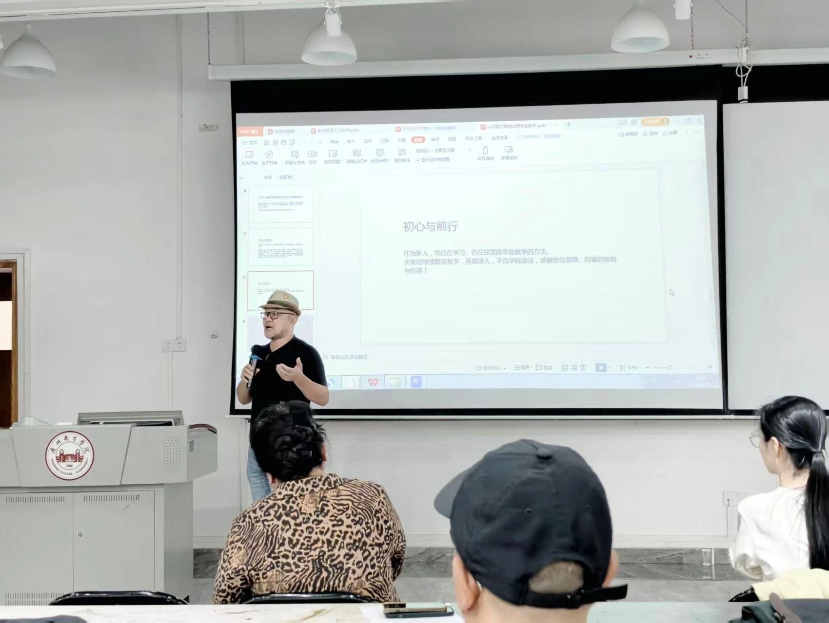 接着,新教师代表陈锐城结合《游戏场景设计》课程,分享了跨专业专升本教学的困惑与探索。他针对摄影、视传、环艺、动画等多元背景员工,尝试保职工原有专业技能,推动跨平台能力融合,以成果为导向设计宽泛适用的教学内容,让知识可跨专业复用,充分展现了青年教师主动钻研、积极成长的良好风貌。