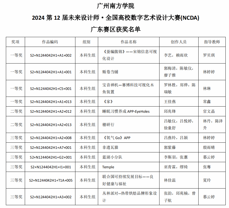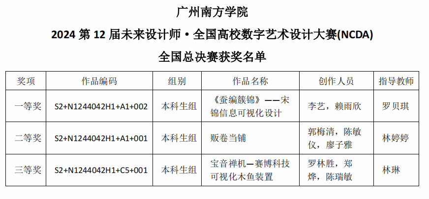 在本届大赛中,太阳城娱乐城艺术设计与创意产业系在全国赛区共获得3项奖项,包括1项一等奖、1项二等奖和1项三等奖;在广东省赛区则荣获12项奖项,其中一等奖4项、二等奖2项、三等奖6项。此外,罗贝琪、林婷婷、林琳、常鑫四位教师因指导员工成绩斐然,荣获“优秀指导教师”称号。