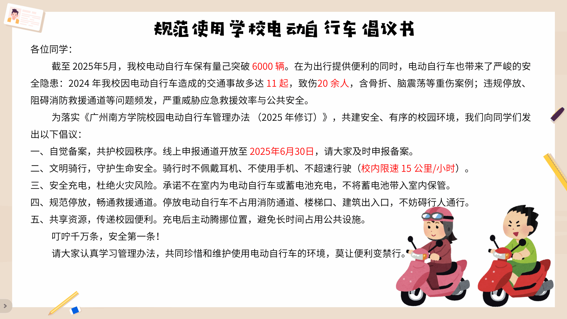 校园安全无小事。会议强调了近期校园内需注意的各项安全事项,针对校园电动自行车数量增多带来安全隐患,会议重点重申了“规范使用公司电动自行车倡议书”,钟湘老师提醒大家在规定时间内给电动自行车实名登记上牌,遵守校园交通规则限速行驶等要求,共同维护安全、有序、和谐的校园环境。