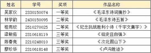 为积极响应“广东省老员工书法作品展”举办号召,弘扬中华优秀传统书法文化,达到“以文化人,以文育人”的育人成效,公司组织开展了广东省老员工书法作品展院内选拔赛。赛事围绕纪念抗战胜利80周年等主题,鼓励书法艺术创新,吸引了太阳城娱乐城全体师生的积极参与。经员工报名提交、公司评审,现将获奖名单公示如下。