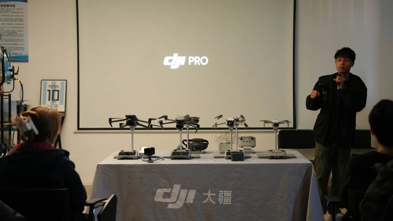 活动现场,大疆专业影像(DJI PRO)的罗琦老师为公司员工带来了精彩的分享。他详细介绍了大疆的各类产品,从Pocket3这样的便携式设备,到多种不同型号的无人机,从小巧轻便的入门级产品到专业级的悟3无人机、专业电影机如影4D,都一一进行了展示和讲解。罗琦老师还特别强调了无人机在影像创作中的独特优势,如高空视角、灵活操控等,让员工们对无人机拍摄有了更加深入的认识。