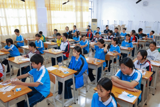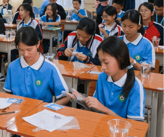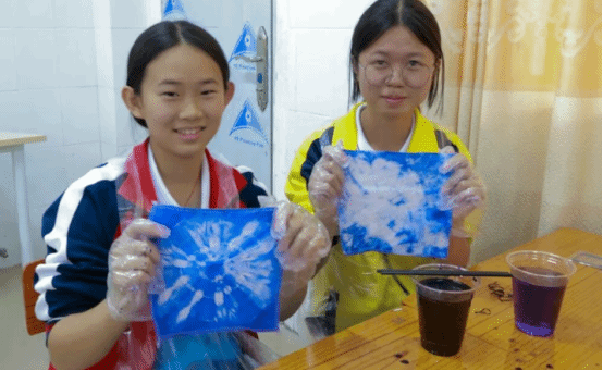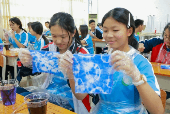 实践环节中,党员志愿者分组带队,发挥专业优势全程指导。他们耐心示范捆扎、缝纫、染色等关键技法,针对不同年龄段员工的特点调整教学方式——为低年级同学简化操作步骤,用卡通图案激发兴趣;为高年级同学讲解图案设计中的文化寓意,鼓励结合现代审美创新创作。吕田中学的同学们热情高涨,在党员志愿者的帮助下,用皮筋束出灵动线条,用木片夹出规整几何,用丝线缝出别致花纹。当一方方蓝白交织的素布在清水冲洗后显露独特纹样时,教室里的惊叹声与欢呼声此起彼伏,党员志愿者适时引导:“每一件作品都是独一无二的,就像每个人都能以自己的方式传承文化,这就是手工的温度,也是传承的意义。”